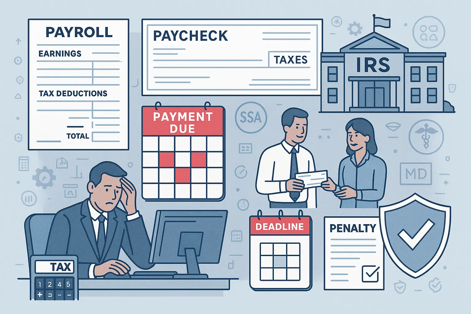 Payroll taxes are the taxes employers must withhold, report, and pay on behalf of their employees’ wages. These taxes fund federal programs such as Social Security, Medicare, and unemployment insurance. They differ from income tax because they are tied directly to compensation paid and employees’ paychecks. Understanding payroll compliance helps employers avoid unpaid payroll taxes, payroll tax penalties, and serious consequences like the trust fund recovery penalty.